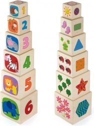 L’ensemble comprend 6 cubes en bois solides de tailles différentes, permettant aux enfants de construire une tour stable ou de les emboîter les uns dans les autres. Les illustrations riches avec des animaux, des couleurs, des formes et des quantités favorisent les premiers apprentissages et enrichissent le vocabulaire.