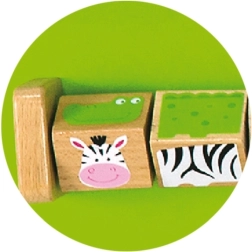 Trois prismes illustrés d’animaux que les enfants font tourner et assemblent pour reconstituer la bonne image – un entraînement à la logique, à la patience et à la perception visuelle.