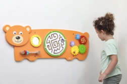 La planche sensorielle Ours est conçue selon les principes Montessori afin de motiver naturellement les enfants à explorer et à exercer leurs compétences. Elle propose plusieurs types d’activités : faire tourner les rouages, guider la bille dans le labyrinthe, s’observer dans le miroir sécurisé et entraîner la préhension grâce aux vis filetées. Grâce à sa structure en bois robuste et à la possibilité de fixation murale, elle convient parfaitement aux chambres d’enfants, salles de jeux et écoles maternelles.