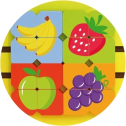 La planche propose des puzzles représentant différents fruits que les enfants peuvent faire glisser, découvrant ainsi diverses formes et couleurs.