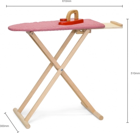 Le set comprend une planche pliable avec étagère de rangement et un fer en bois avec bouton rotatif pour encore plus de plaisir. Grâce à ses dimensions compactes, il se range facilement et s’intègre dans toutes les chambres d’enfants.