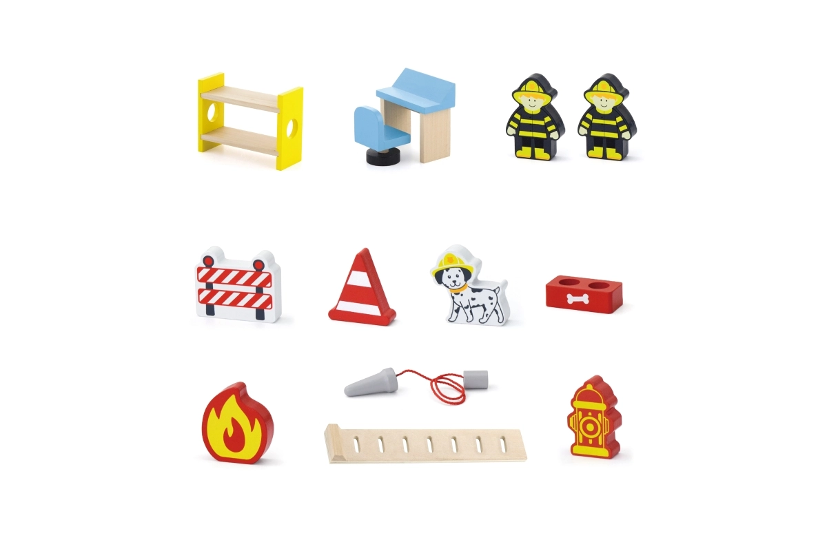 La boîte contient tout pour jouer immédiatement : le bâtiment de la caserne, 2 pompiers, un hélicoptère, un camion de pompiers, un hydrant, un lit superposé, une chaise, un panneau de contrôle et une échelle. Les matériaux et les peintures sont sûrs et non toxiques, afin que les enfants puissent jouer en toute tranquillité. Idéal comme cadeau à la fois plaisant et durable.