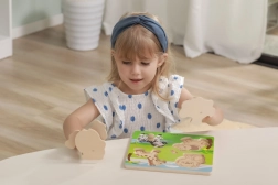 Sous chaque pièce se trouve une illustration pour un appariement facile. Les enfants s’exercent naturellement à reconnaître les formes et les animaux.