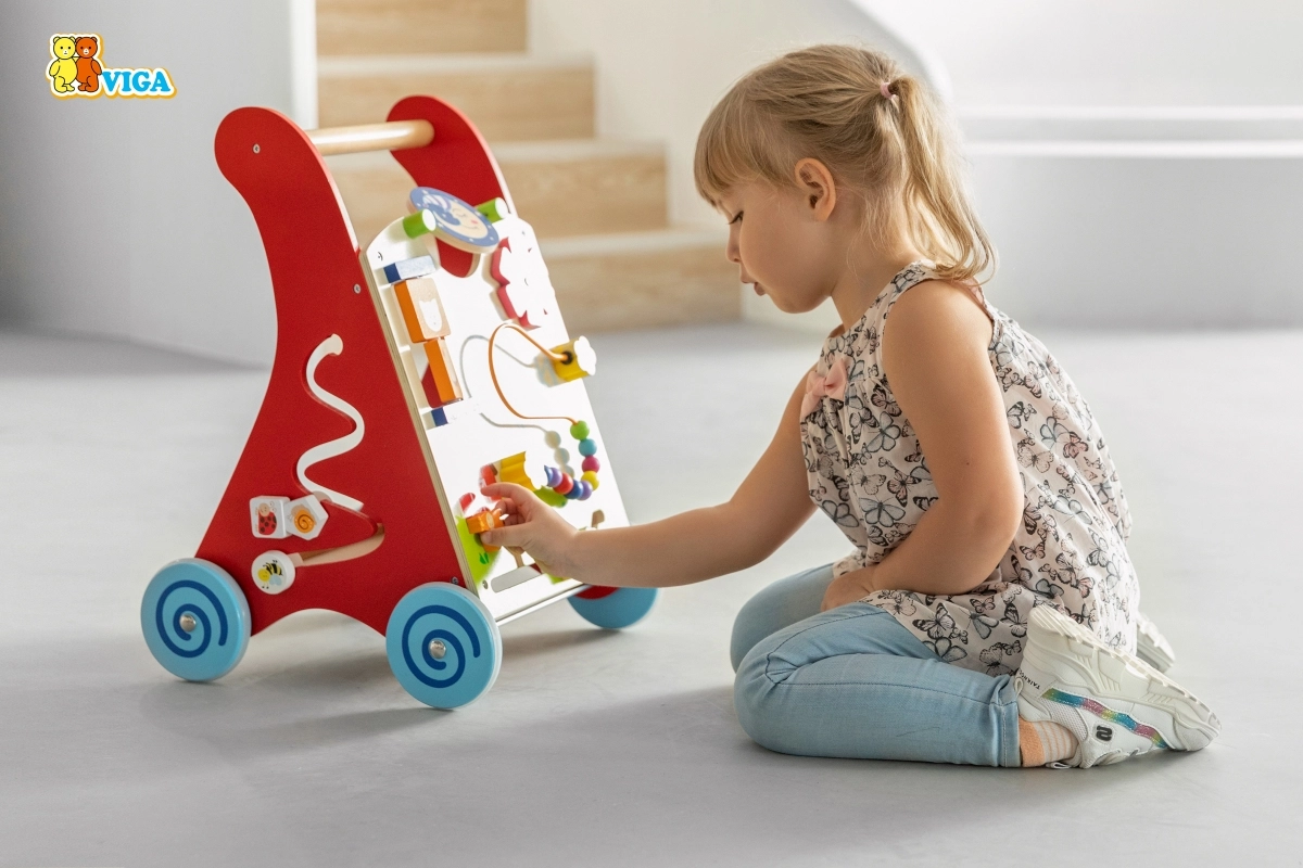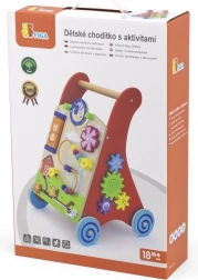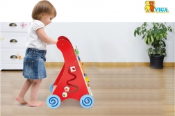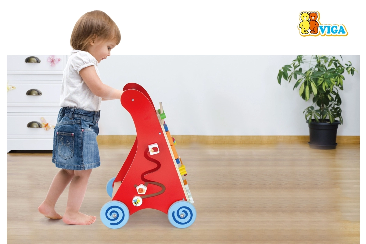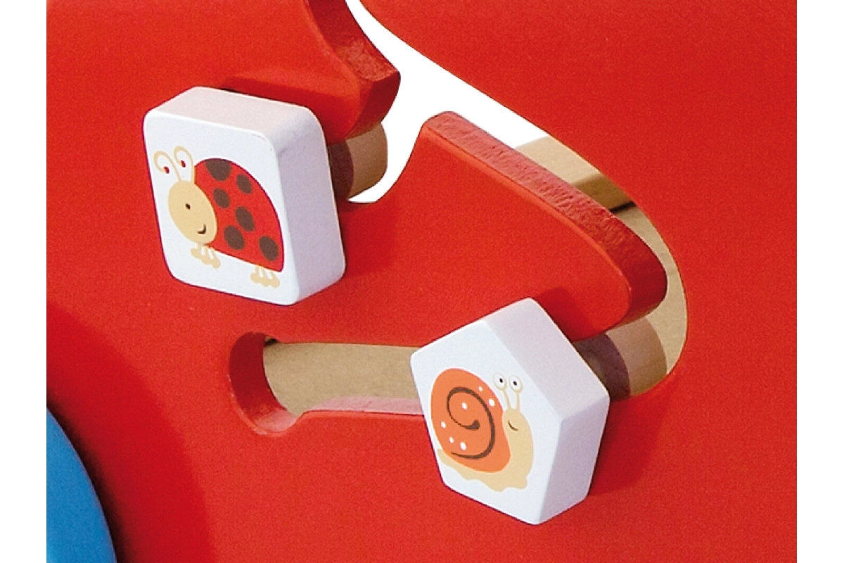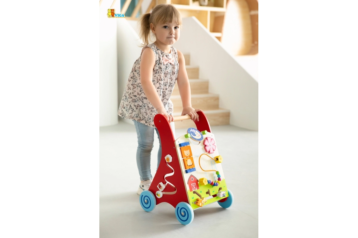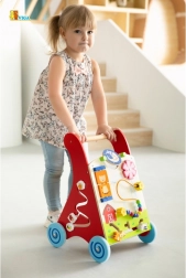 Les roues largement écartées avec revêtement en caoutchouc protègent le sol et augmentent la stabilité, la poignée en bois est adaptée aux petites mains. Le produit est en bois laqué, les vernis et peintures sont conformes aux normes EN71 et ASTM. Un accessoire idéal à la maison pour développer motricité, patience et imagination.