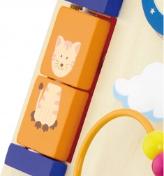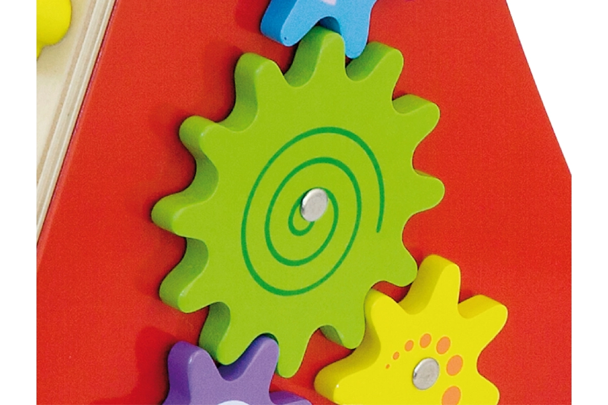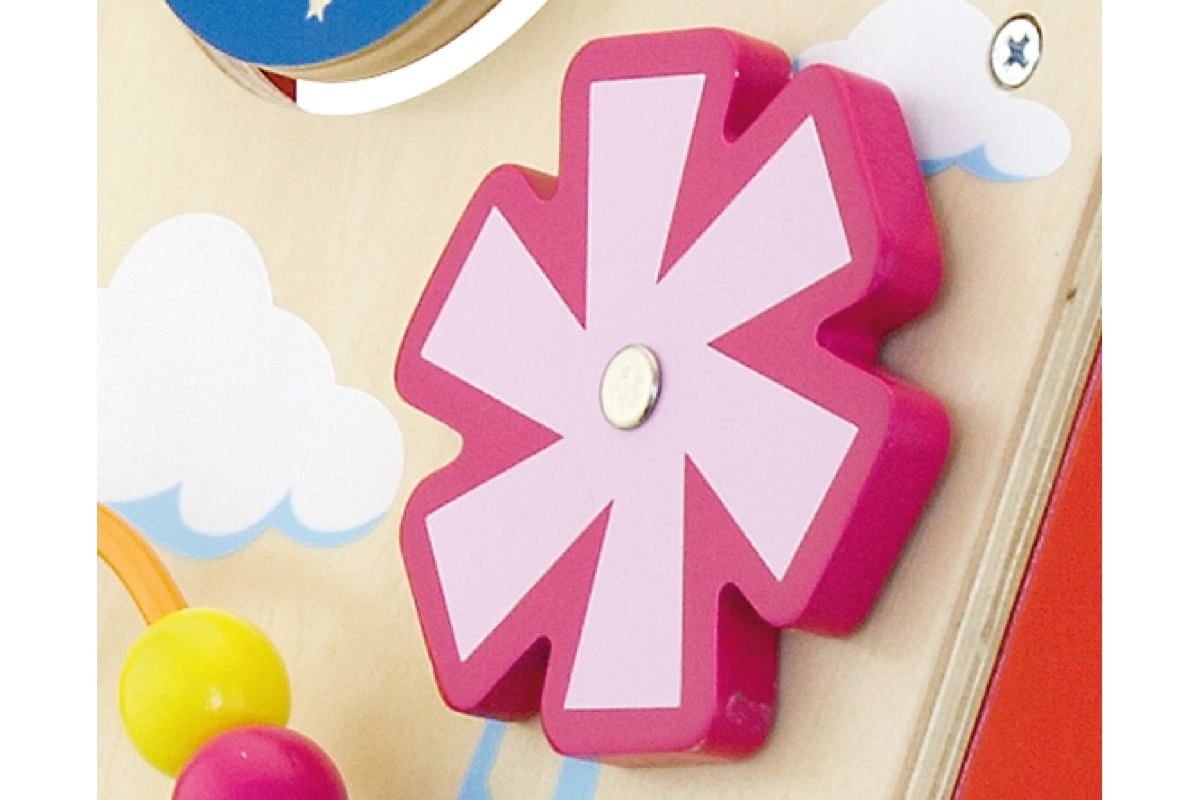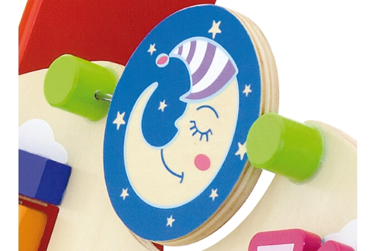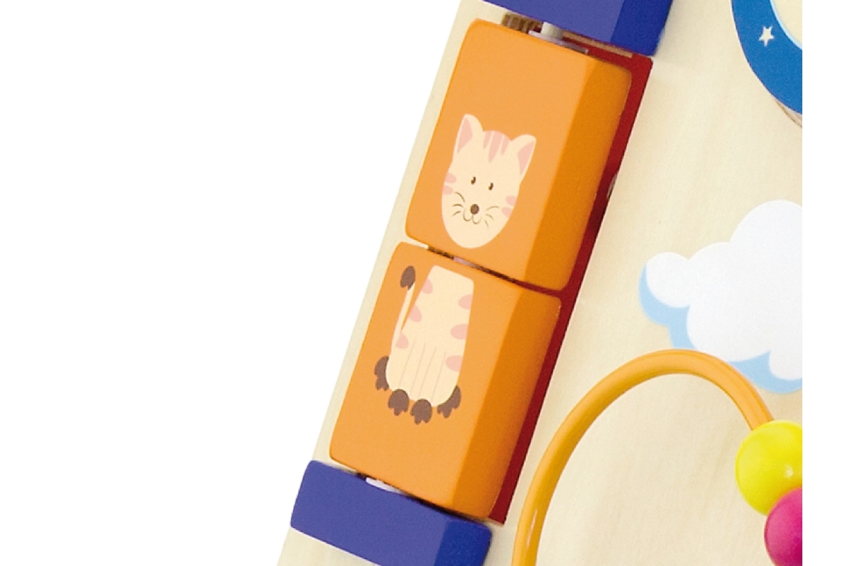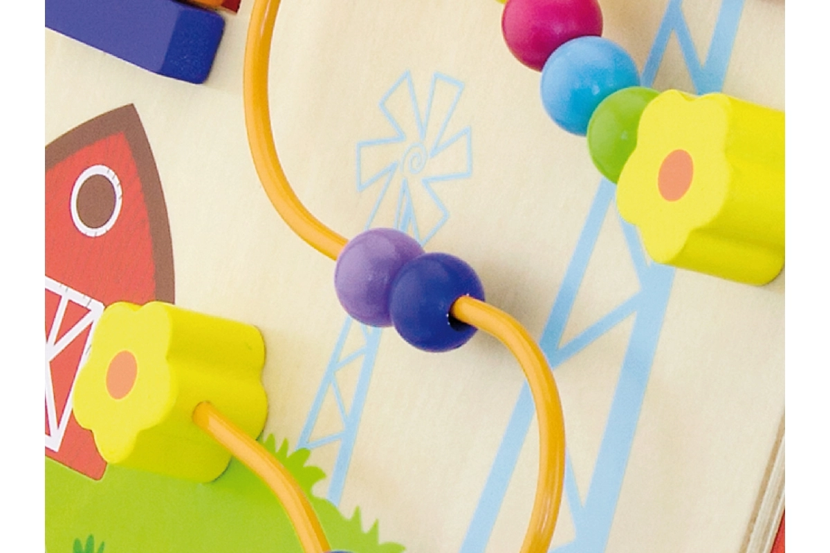 Éléments rotatifs, petits animaux coulissants, boucle de perles et moulin favorisent la motricité fine, la patience et la compréhension des causes et des effets.