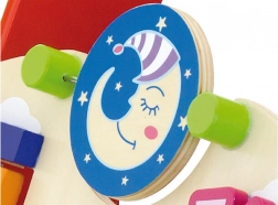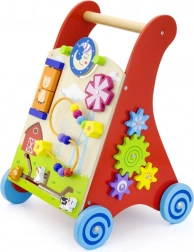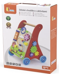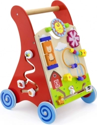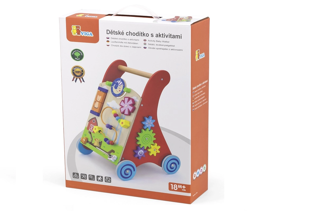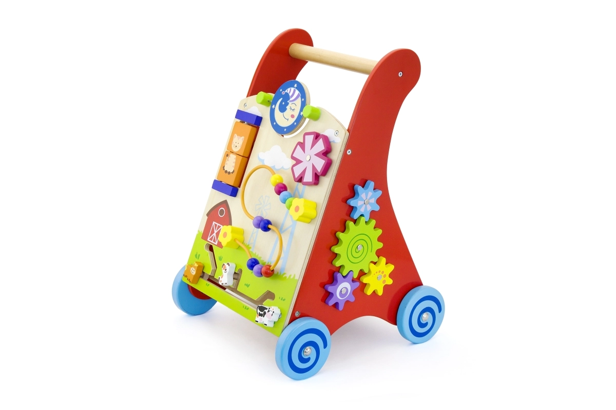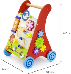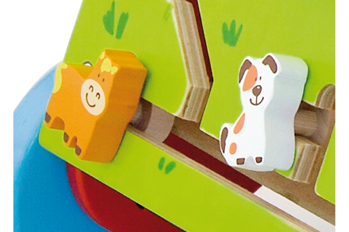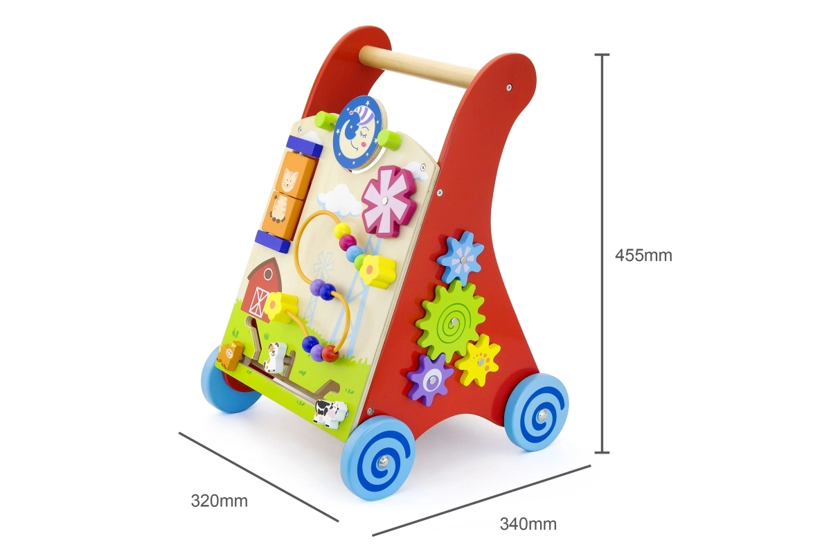Ce chariot de marche en bois de haute qualité avec centre d’activités combine soutien à la marche et riches stimuli sensoriels. Le panneau avant propose des éléments rotatifs avec soleil et lune, un moulin à vent tournant, une boucle motrice à cinq perles, un disque rotatif avec un chat et des petits animaux coulissants (vache, chien, cheval) se déplaçant sur une piste vers la grange. Les côtés sont complétés par des roues dentées et une piste avec une abeille, une coccinelle et un escargot.