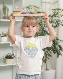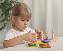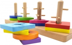 En assemblant différentes formes sur des tiges en bois, le jouet favorise le développement de la motricité fine et de la coordination œil-main.