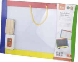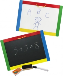 Ce tableau polyvalent réunit deux surfaces créatives en une – une face noire magnétique pour la craie et une face blanche effaçable pour le feutre. Les enfants peuvent écrire, dessiner et s'entraîner aux lettres et aux chiffres; sur la face noire, ils peuvent en plus fixer facilement des aimants. L'emballage contient tout pour une utilisation immédiate: 4 craies, un feutre effaçable et une éponge.