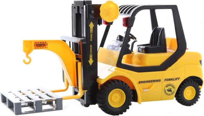 Un chariot élévateur en plastique réaliste à l’échelle 1:14 ravira les petits constructeurs dès 3 ans. En appuyant sur un bouton, il émet des sons et s’allume, ce qui renforce le jeu de rôle réaliste d’entrepôt ou de chantier. L’alimentation est assurée par 3× piles AG13/LR44, incluses dans l’emballage.