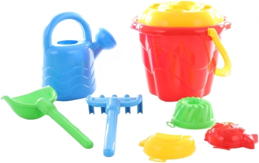 Set complet pour le sable avec seau, râteau, pelle, arrosoir, tamis et 3 moules en plastique de qualité. Résistant et amusant pour les enfants.