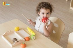Grâce au velcro, les fruits peuvent être coupés et rassemblés en un seul geste, ce qui favorise le développement de la motricité fine.