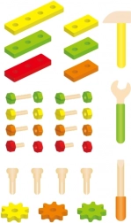 Tous les composants sont adaptés aux petites mains et fabriqués en bois durable. Grâce à l’abondance de vis, d’écrous et de plaquettes, les possibilités de combinaison sont infinies, stimulant l’imagination et la patience. Le set est parfait pour le jeu autonome comme pour les activités en famille.