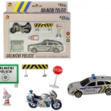 Voiture de police en métal, moto en plastique, panneaux de signalisation en plastique