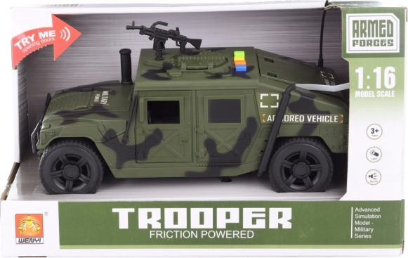 Une voiture militaire réaliste à piles qui ravira chaque petit conducteur. En appuyant sur les boutons, elle émet des sons et s’illumine, possède des portes ouvrantes et des dimensions compactes idéales pour jouer à la maison comme en extérieur. L’alimentation est assurée par les piles AG13 fournies. Convient aux enfants à partir de 3 ans.