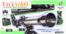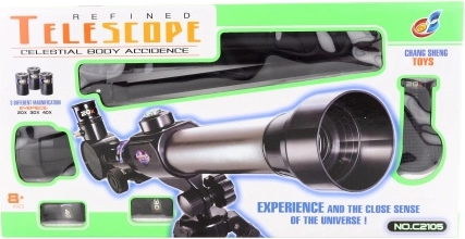 Télescope en plastique avec trépied. Diamètre de l’objectif 60 mm, distance de mise au point 170 mm, grossissements 20x, 30x et 40x. Dimensions de l’emballage env. 43 × 22 × 8 cm. Âge 8+.