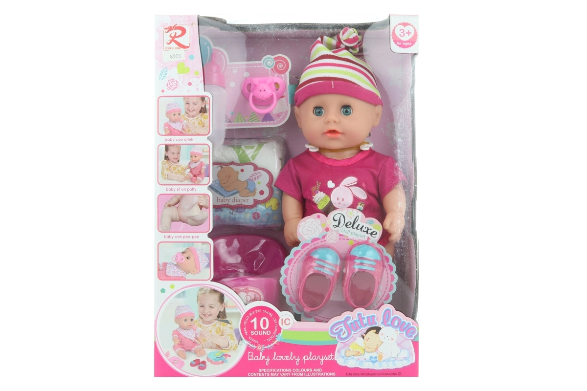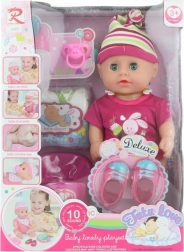 Adorable bébé de 30 cm qui, une fois les piles insérées, émet des sons réalistes et peut faire pipi. L’emballage comprend un riche ensemble d’accessoires, dont des chaussons, un bavoir en plastique, un biberon et une assiette. Les piles sont incluses pour que les enfants puissent jouer immédiatement après le déballage.