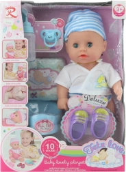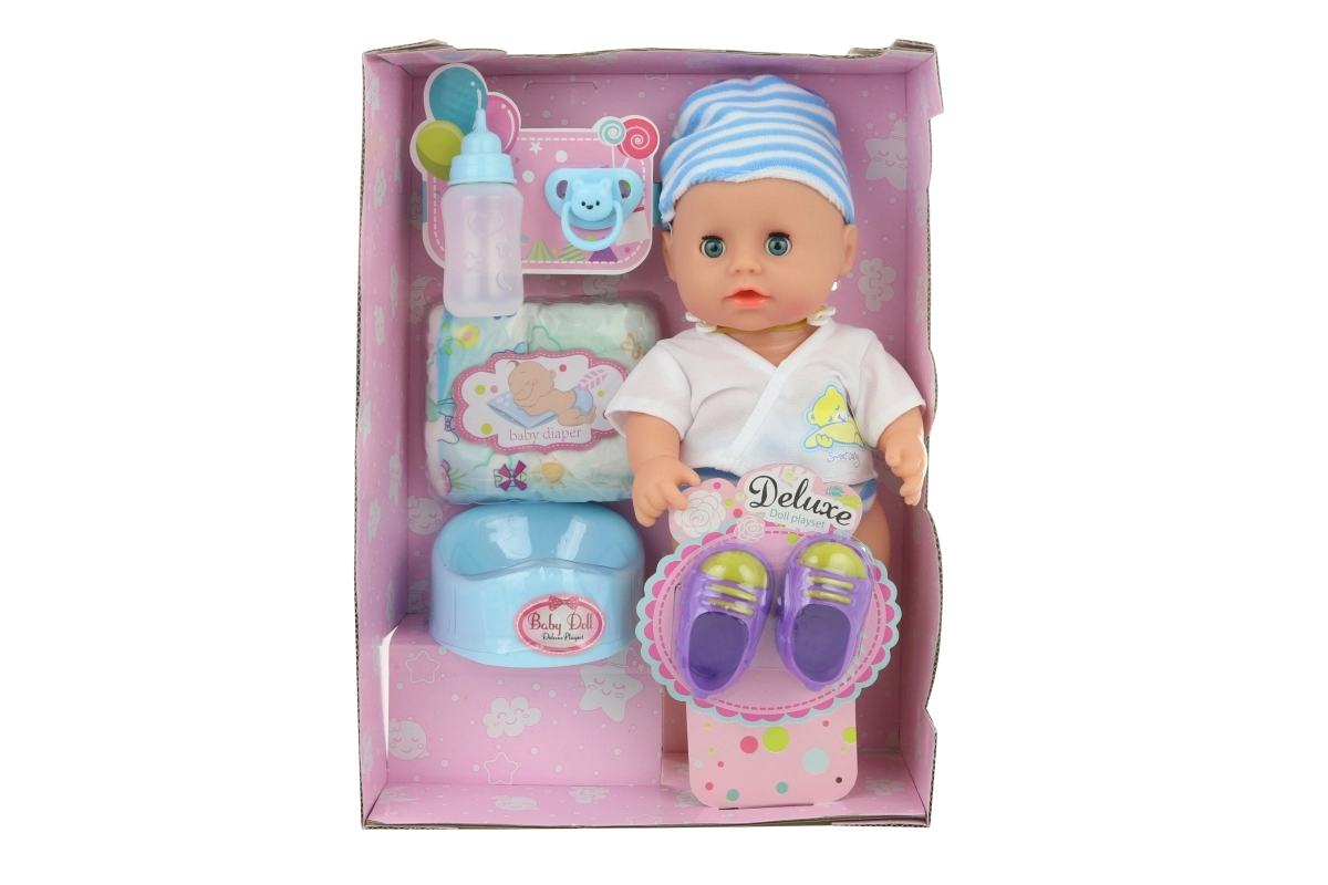 Adorable bébé de 30 cm qui ravira chaque petit·e soignant·e. Après insertion des piles, il émet des sons réalistes et sait faire pipi. L’emballage comprend des chaussures, un bavoir, un biberon, une assiette et d’autres accessoires pour jouer aux parents. Idéal pour les enfants dès 3 ans.