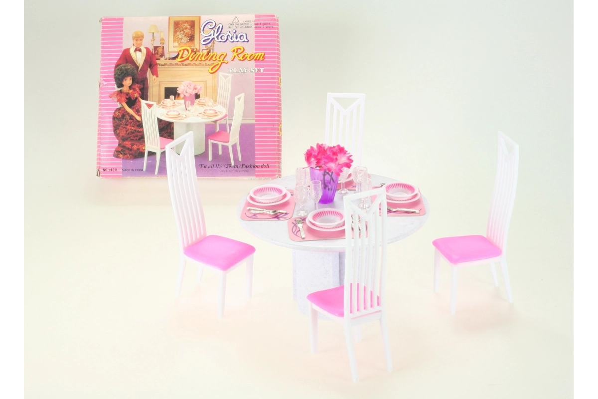 Le set de salle à manger élégant pour poupées Glorie transforme chaque jeu d’enfant en un festin réaliste. Il comprend une table ronde, 4 chaises et 4 services de table complets. Idéal pour le jeu créatif et le développement de l’imagination des enfants à partir de 3 ans.