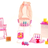 - Équipement complet : commode, berceau à baldaquin, transat, fauteuil à bascule, jouets et accessoires pour bébé.