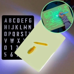 Le tableau est idéal pour le dessin individuel ou l'utilisation de pochoirs, avec des résultats optimaux dans l'obscurité. Avec notre ensemble, les enfants créeront une quantité illimitée d'images qui prendront toujours vie à nouveau.