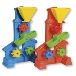 Ce moulin robuste est un excellent compagnon pour le bac à sable comme pour les jeux d’eau. Les enfants peuvent verser du sable ou de l’eau dans la large trémie avec régulation et observer comment les trois roues colorées s’animent et tournent. La rigole de séparation aide à orienter le flux et encourage l’expérimentation.