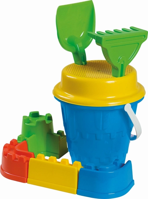- Seau en forme de château, tamis, pelle, râteau, 4 moules de remparts