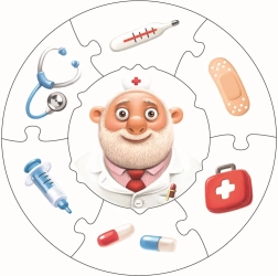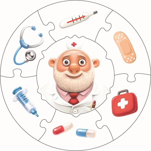 Le puzzle rond avec la figure du médecin apprend aux enfants à reconnaître les principaux instruments médicaux – du stéthoscope au thermomètre – et enrichit leur vocabulaire ainsi que leur capacité d'association logique.