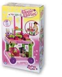 - Chariot mobile avec auvent amovible, comptoir latéral extensible, 4 paniers avec poignée, caisse avec pièces, balance avec plateaux, 12 pcs de fruits et légumes, 8 boîtes de produits