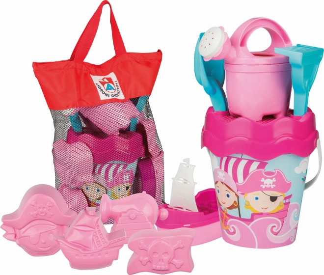 Seau (Ø 17 cm), tamis, arrosoir 0,5 l, pelle, râteau, bateau pirate, 4 moules
