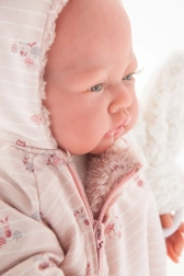 Des cheveux délicatement dessinés, des veines, des ongles et des sourcils créent l’apparence authentique d’un nouveau-né. Le traitement spécial de la peau donne un rendu naturel et une douceur au toucher.