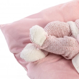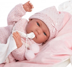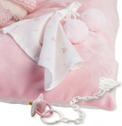 La poupée est habillée d'une tenue en tricot rose avec un bonnet et des chaussons pour un look réaliste pendant le jeu.
