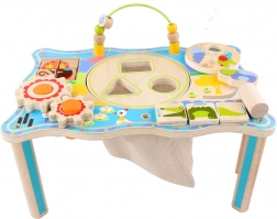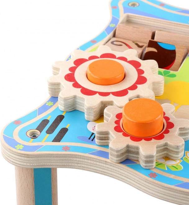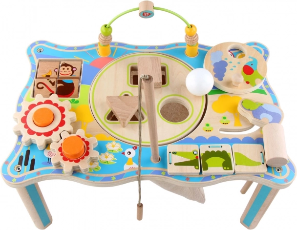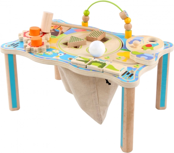 La table en bois aux motifs de jungle allie jeu et apprentissage et favorise la motricité fine, la coordination œil-main et la pensée logique. Les enfants peuvent faire tourner des engrenages, faire glisser des perles le long d’un rail, entraîner force et concentration avec le banc à marteler et s’exercer à la reconnaissance des formes grâce à la boîte d’encastrement. Au centre se trouve un sac en lin pour les poissons pêchés et les pièces de jeu, qui maintient la surface de jeu en ordre.