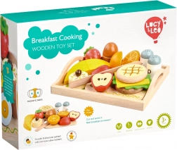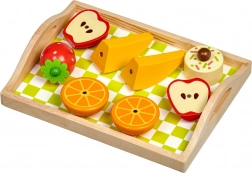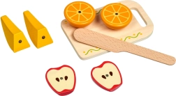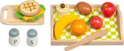 Le set comprend tout pour les petits chefs : un plateau à motif à carreaux, une planche, un couteau, une salière et une poivrière, ainsi qu’un large choix d’aliments – pain, fromage et salade, œuf, banane, pomme, orange, fraise et petit gâteau. L’accent mis sur les matériaux de qualité et la conception durable garantit une longue durée de vie et un jeu en toute sécurité.