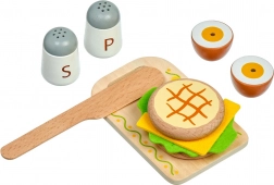 Des composants en bois robustes complétés par des tranches textiles de fromage et de salade. Conception durable et couleurs intenses pour un amusement long et sûr.