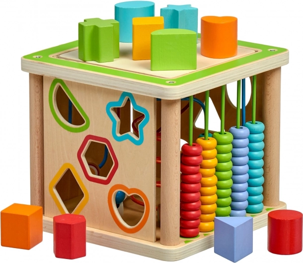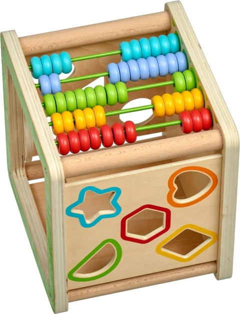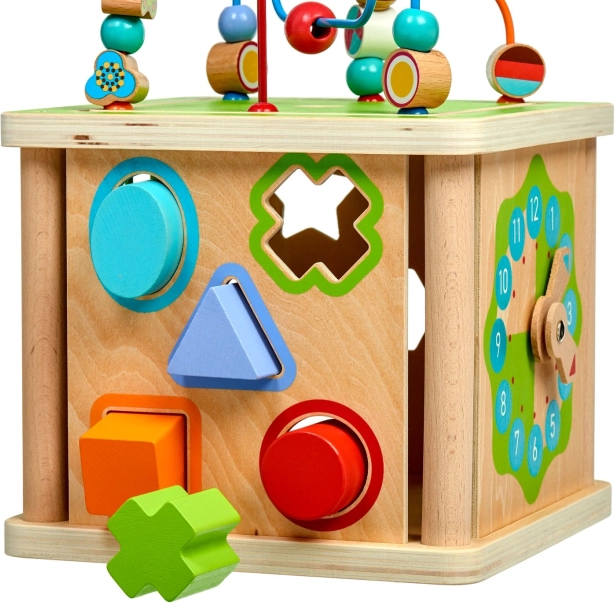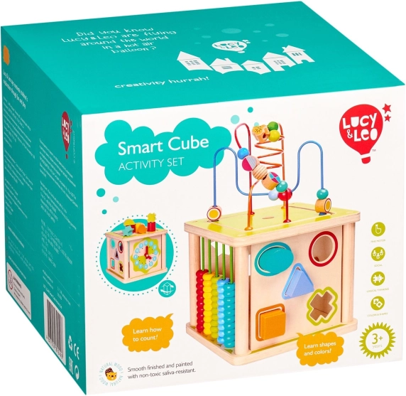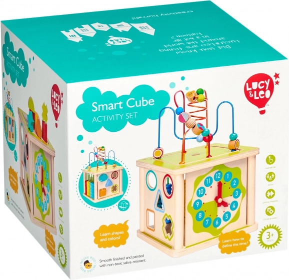 Ce cube d’activités en bois 5‑en‑1 LUCY & LEO de grande qualité est un jouet éducatif idéal pour les petits explorateurs. Il propose plusieurs activités en une seule: un labyrinthe de perles sur le dessus, une horloge avec aiguilles mobiles, deux encastrements de formes géométriques et un abaque coloré. Grâce à sa conception soignée, il développe la coordination œil‑main, la concentration et la représentation spatiale.