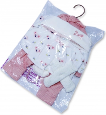 - Contenu du set : robe/combinaison, pantalon, bonnet, chaussettes, doudou « hug me »