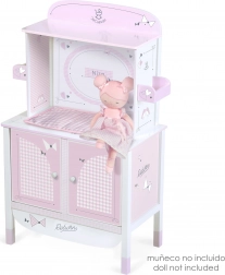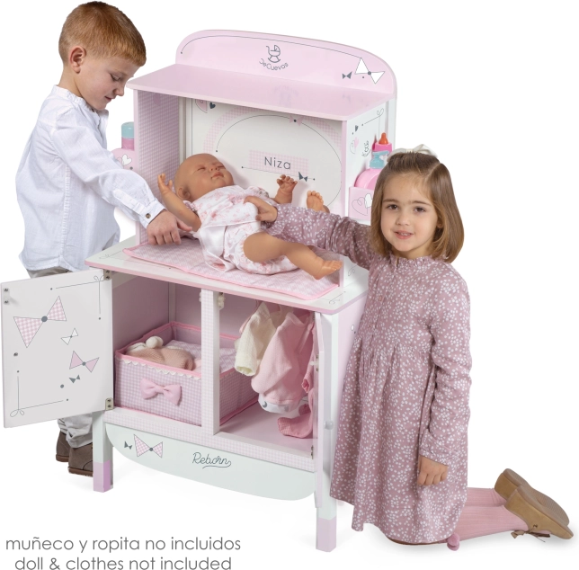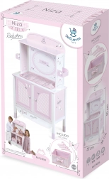Découvrez la collection Niza dans un rose tendre avec cette armoire pour poupées, belle et pratique, qui combine à la fois espace de rangement et centre de change. La partie inférieure comprend une tringle et un tiroir pour les tenues, tandis que la partie supérieure sert de table à langer avec imprimé assorti à la collection.