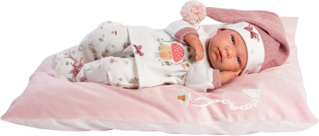 Habilement vêtue d'une combinaison stylée de t-shirt, pantalon, bonnet, chaussettes et coussin, la poupée offre de multiples possibilités de jeu. Un joli tétine est incluse dans l'emballage. Son corps en vinyle permet un bain jusqu'au cou.