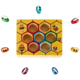 Jeu éducatif Nids d'abeilles Montessori soutient le développement des compétences motrices et l'autonomie des enfants. Il comprend une base en bois massif et sept abeilles colorées que les enfants placent dans les trous appropriés à l'aide d'une pince en plastique rouge fournie.