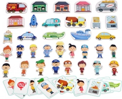 Un riche assortiment de pièces magnétiques et de cartes recto verso motive les enfants à associer correctement et à créer librement en découvrant différents métiers.