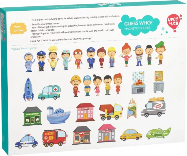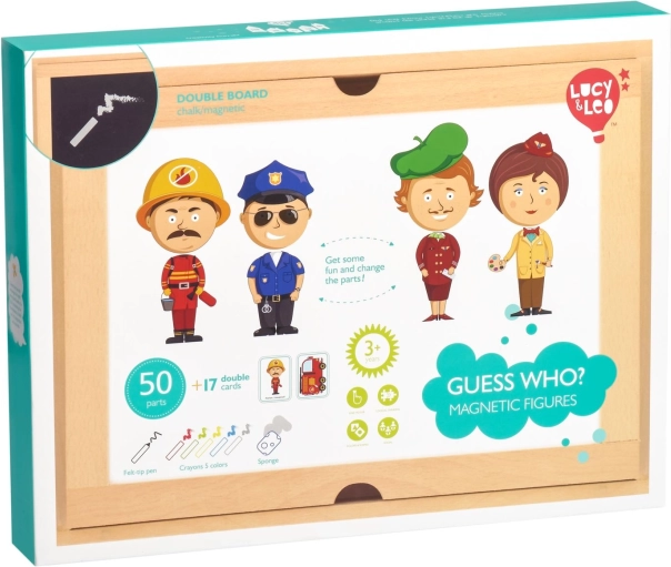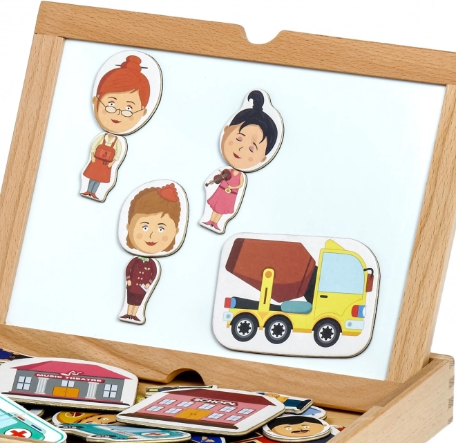 Ce set magnétique créatif présente de manière ludique le monde des métiers – du pompier et du policier jusqu’au cuisinier ou au pilote. Grâce aux cartes recto verso, les enfants peuvent assembler les bonnes combinaisons ou créer leurs propres personnages et scènes. La valisette en bois avec tableau magnétique assure un rangement pratique de toutes les pièces et un transport facile en voyage.