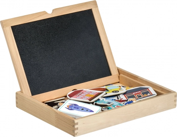 Le coffret comprend une éponge effaçable, un feutre noir pour écrire sur le tableau blanc et 5 craies de couleur pour dessiner sur la face noire. Les enfants entraînent ainsi les couleurs, la coordination œil–main et la représentation spatiale, et en suivant les modèles, ils développent leurs compétences sensorielles et leur créativité.