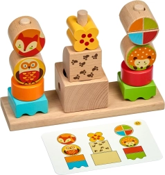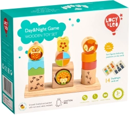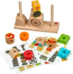 Le puzzle interactif « Jour et Nuit » allie amusement et apprentissage. Les enfants empilent des formes géométriques colorées et des blocs avec des animaux sur trois chevilles en suivant les modèles fournis. Les cartes de jour mettent l’accent sur les couleurs, celles de nuit sur les formes – idéal pour une progression étape par étape.