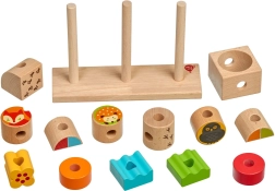 Le socle stable et les trois chevilles facilitent l’assemblage correct des pièces. Les enfants entraînent leur motricité fine et la coordination main–œil en enfilant et en empilant.