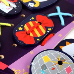 Découvrez le set de laçage en bois créatif Lucy & Leo, qui développe la motricité fine, la créativité et la reconnaissance des couleurs et des formes. L’ensemble comprend 31 pièces en bois, 4 lacets colorés et une grande plaque avec un magicien, sur laquelle les enfants enfilent et fixent des décorations selon leur imagination.