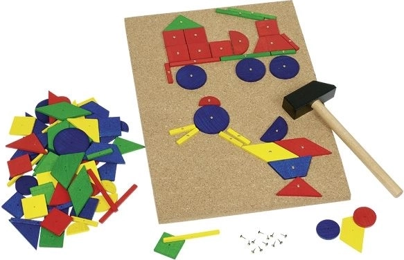 Découvrez un jouet éducatif amusant qui stimule l’imagination et la patience. Les enfants disposent des formes géométriques colorées sur la planche en liège solide et les fixent à l’aide d’un petit marteau en bois et de clous. Le set est parfait pour des premiers projets de construction et des jeux créatifs.