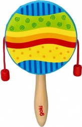 Le « tambour du mendiant » traditionnel, revisité par la marque GOKI, est un excellent instrument d’accompagnement pour les enfants. Tournez la poignée et les perles rouges au bout des cordelettes résonnent rythmiquement contre la peau du tambour. La vitesse de rotation modifie naturellement le tempo et le caractère du son, ce qui stimule la perception auditive et le sens du rythme.