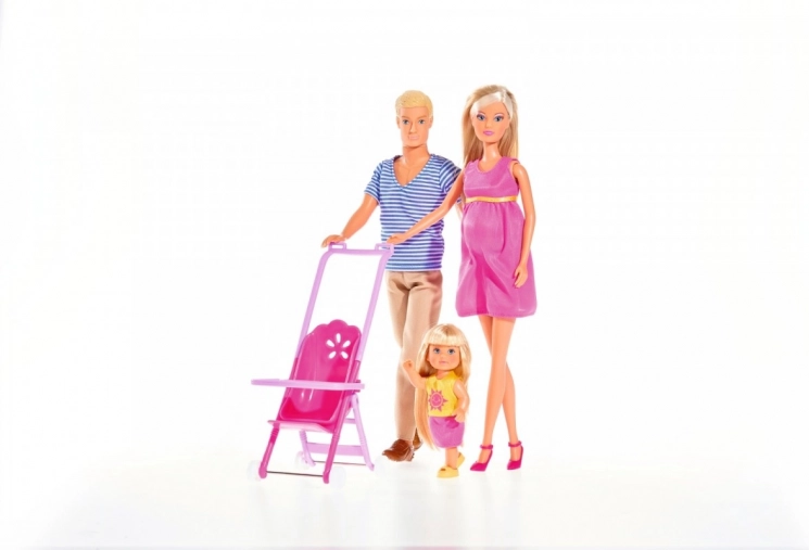 Le set Steffi Happy Family comprend 3 poupées : Steffi enceinte, Kevin et la petite Evi dans une poussette. Il inclut également plus de 19 accessoires.