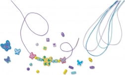 Le kit comprend des perles en bois de différentes formes (papillons, fleurs, perles rondes) et des cordons textiles – idéal pour réaliser colliers et bracelets. Développe la motricité fine et la créativité, recommandé dès 4 ans.