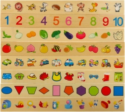 Ce jeu en bois astucieux développe la perception visuelle, la concentration et la coordination œil-main. La tâche consiste à choisir la bonne petite plaquette illustrée et à l’insérer dans la fente sous le motif identique sur la grande réglette. Grâce aux illustrations claires (chiffres, formes, animaux, fruits, objets), les enfants s’entraînent à nommer et à classer.